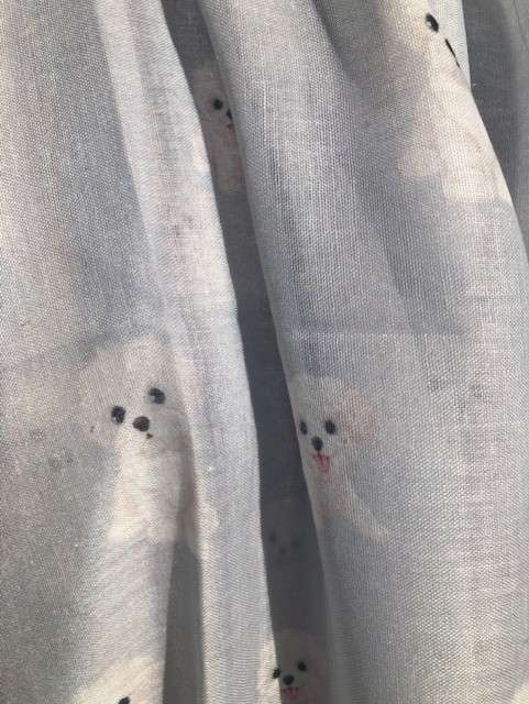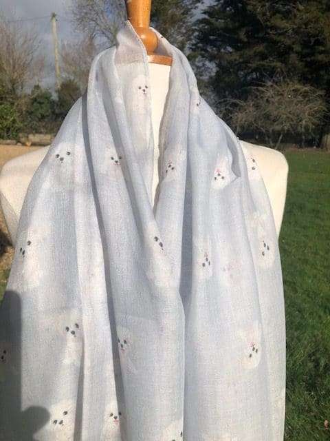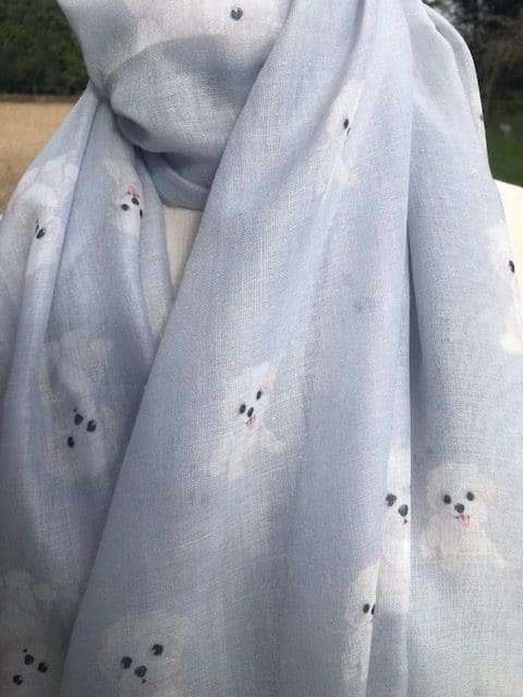 Lightweight frayed edge fashion scarf in blue/grey printed with Bishon Frise