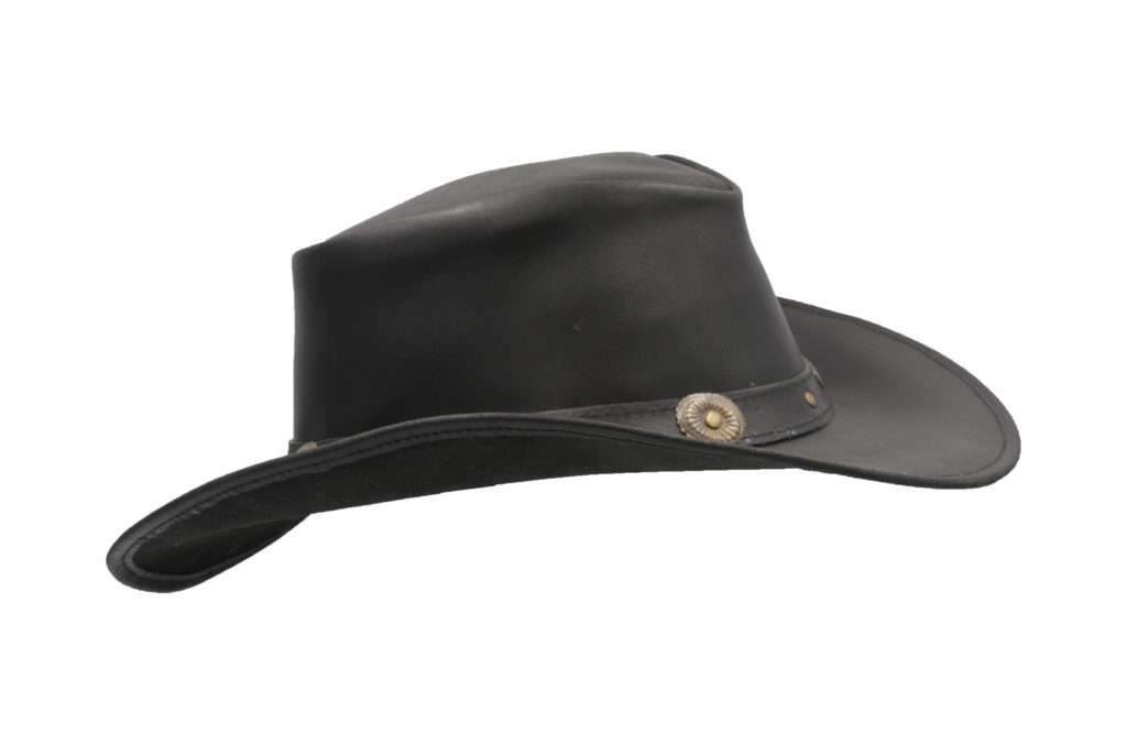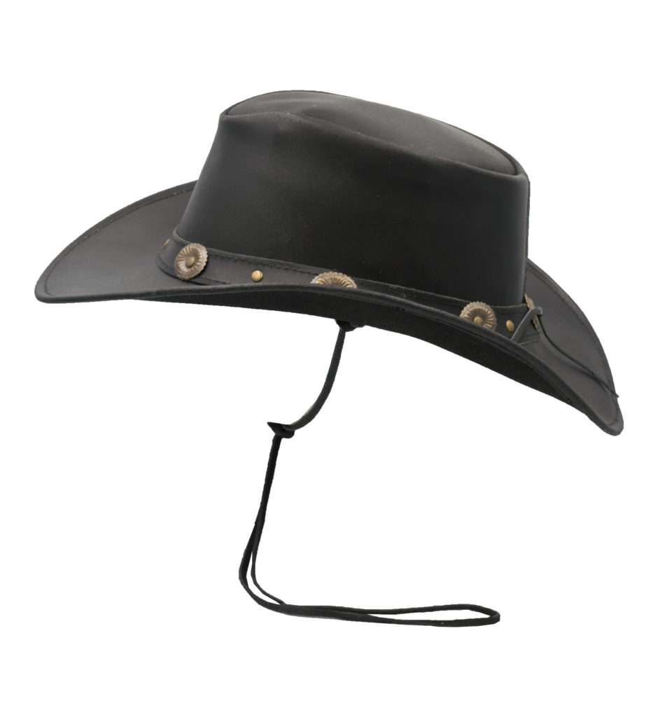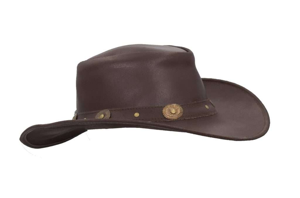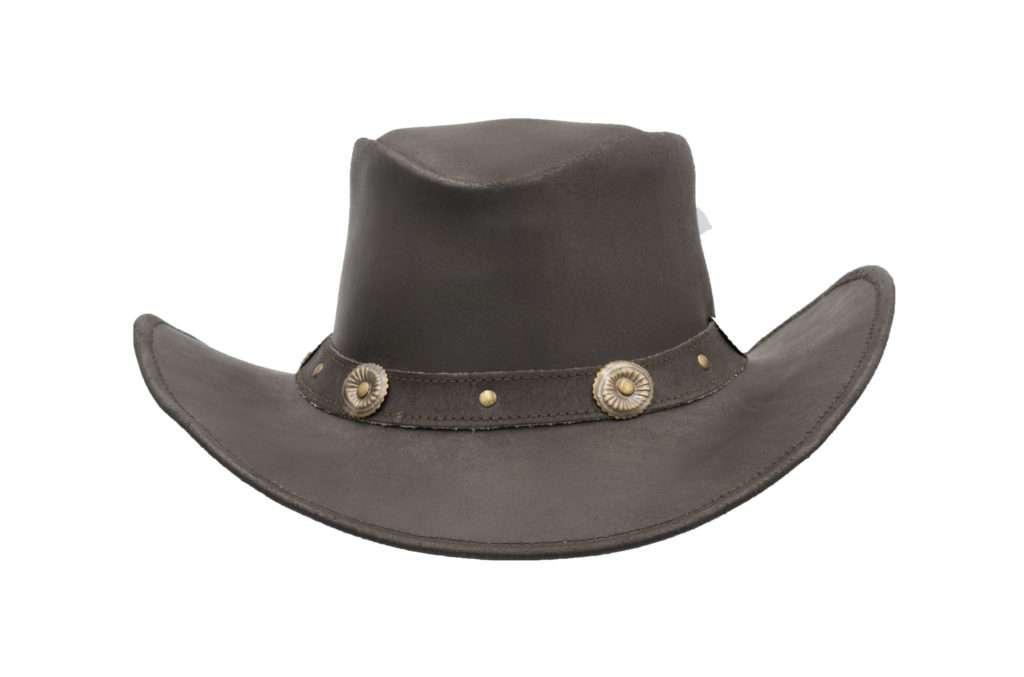Our hat is crafted of naturally water resistant full grain cowhide leather, trimmed with a Leather strap band with brass conchos and studs which adds a fine finish to your leisure wardrobe.
