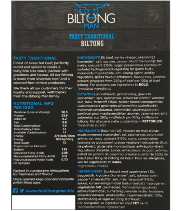 • Like all our flavors Tasty Traditional Biltong is marinated carefully with our special family recipe.