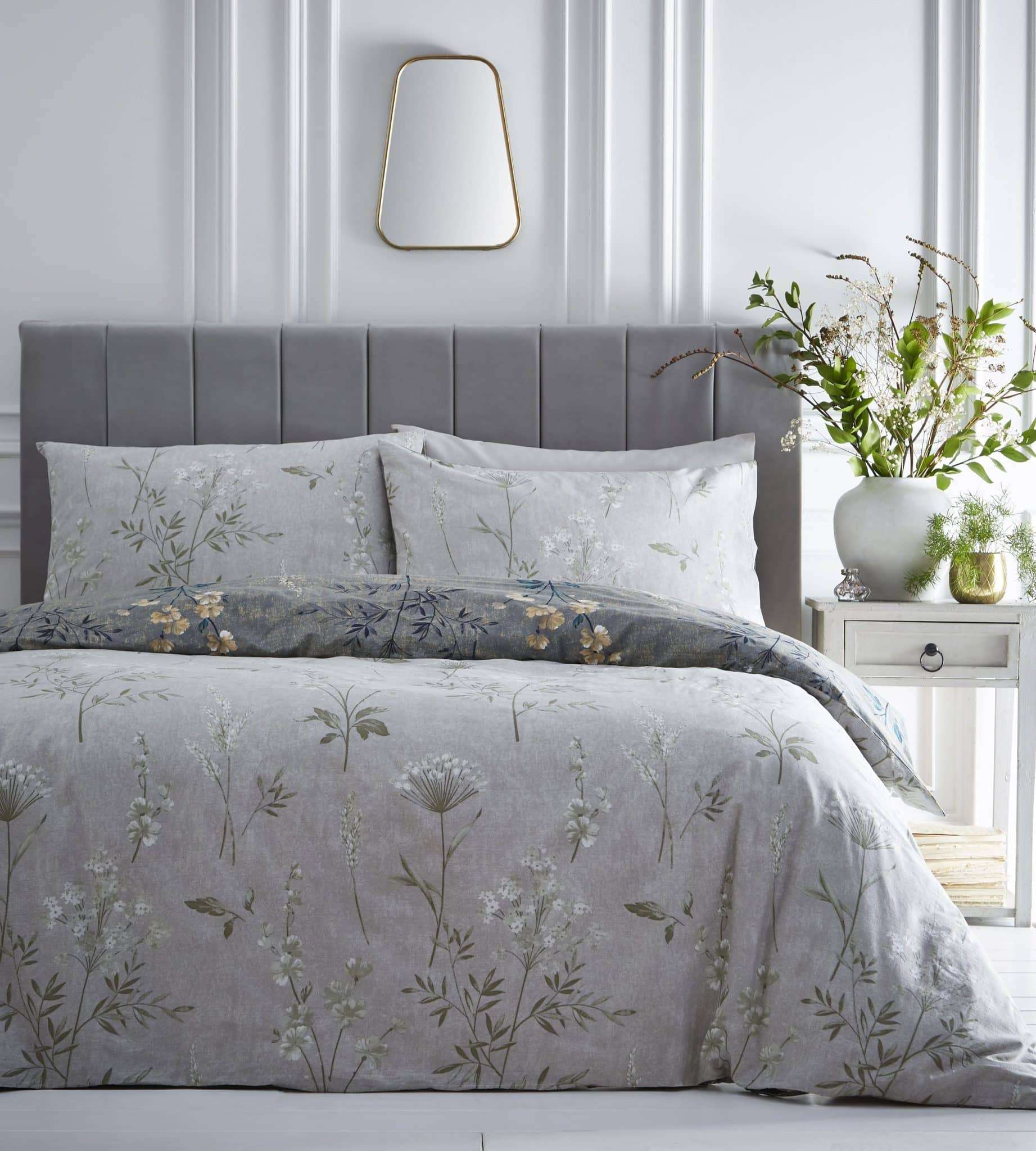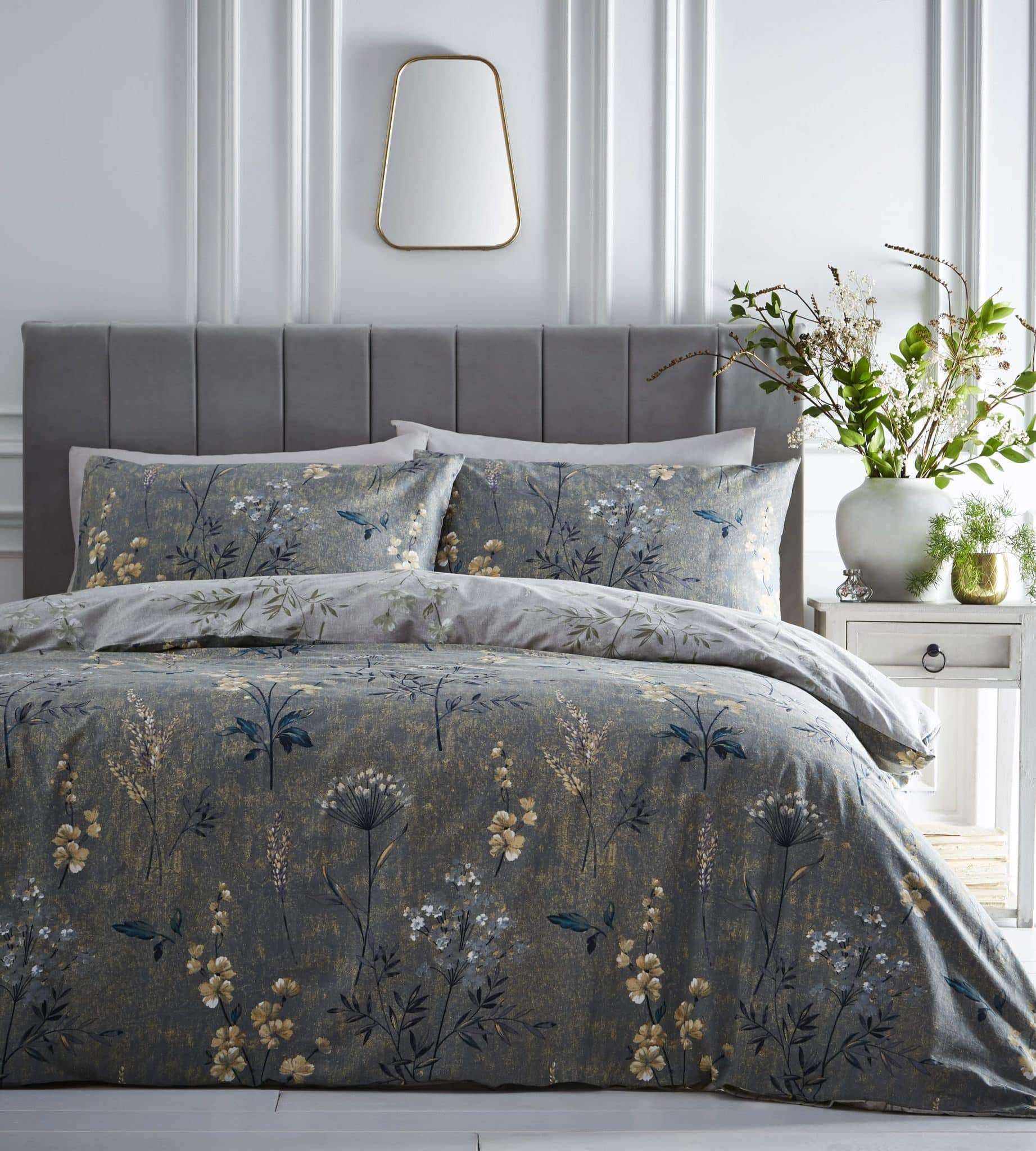 Beautifully hand drawn floral meadow print, painted in metallic tones of green and ochre, capture the English Countryside to bring the outdoors in. Complimented with a soft grey floral print reverse.