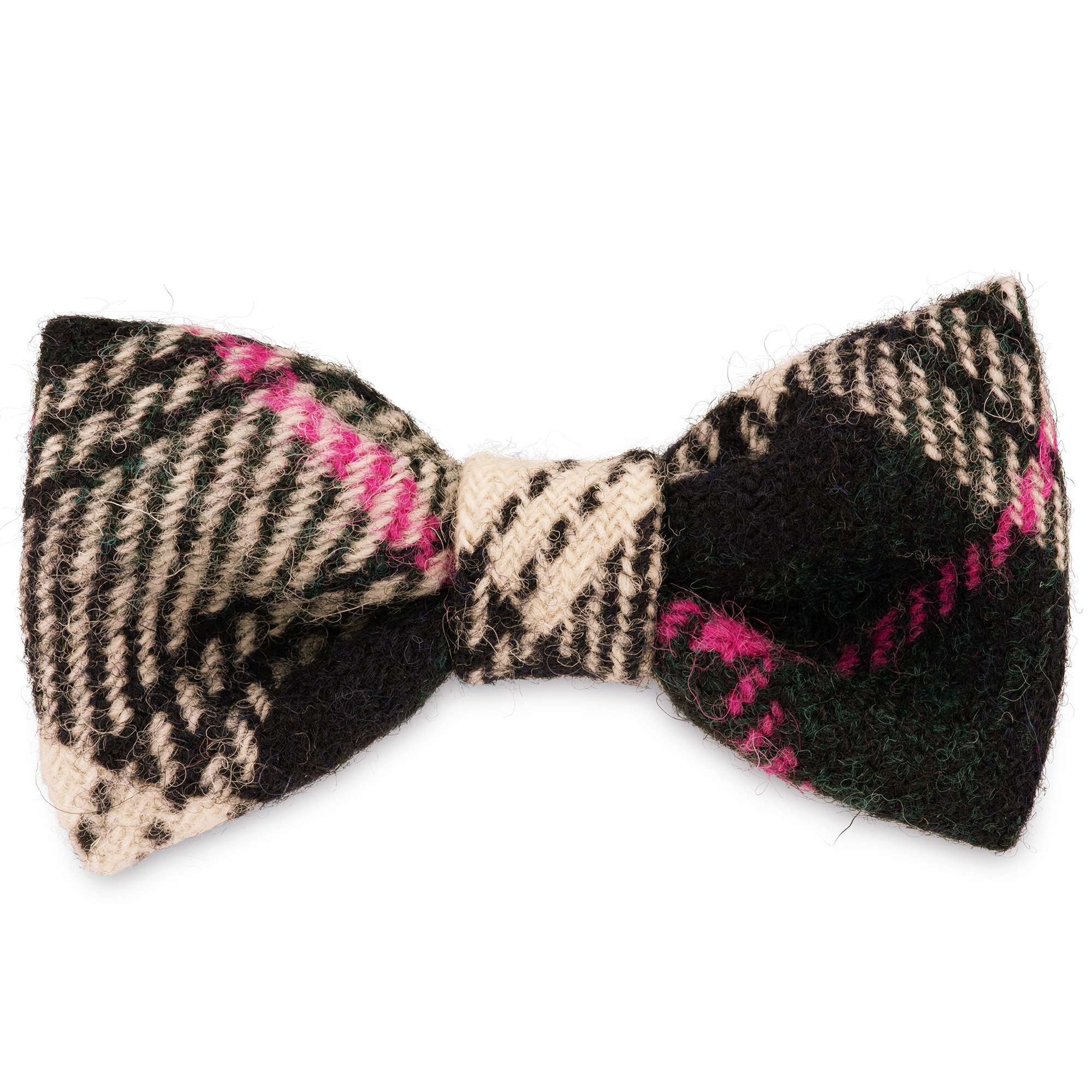 A striking Harris Tweed with a prominent bright pink weave in a large black and white check.