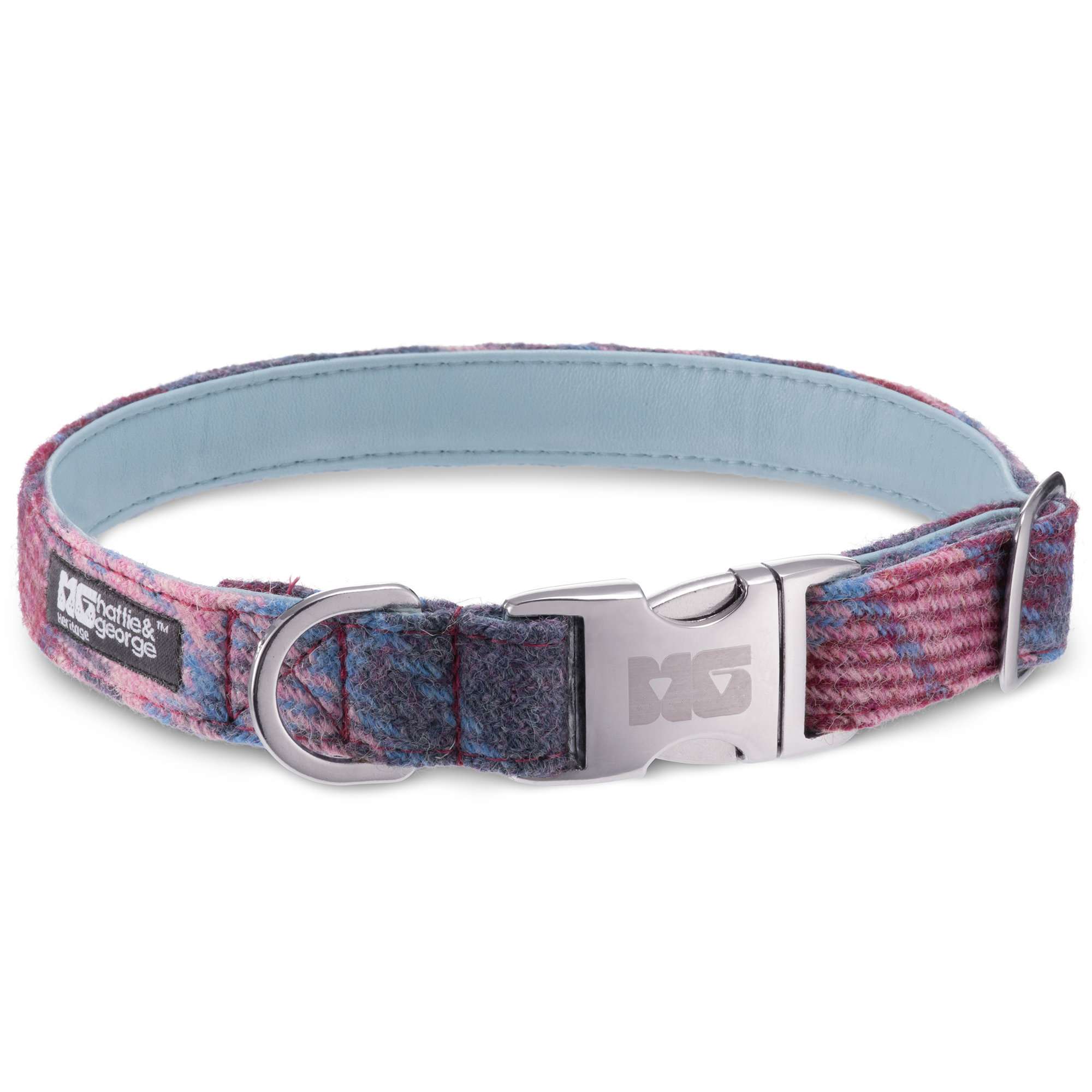 Pinks, purples, blues and greys dance together in this gorgeous Harris Tweed check. A little more subtle in design to Purdy in Pink, this fabric is a stunning blend of colours.. This collar is lovingly made in the UK.