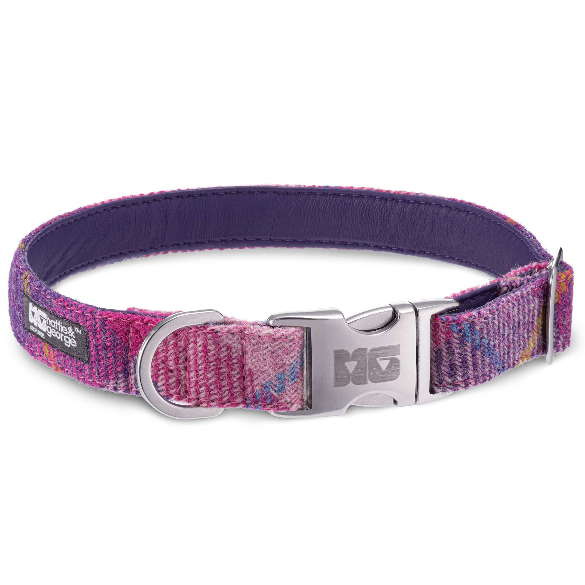 Look at me! This is the colour for your prince or princess. Pinks, purples and blues in this glamorous Harris Tweed check lovingly crafted into a collar of your choice.